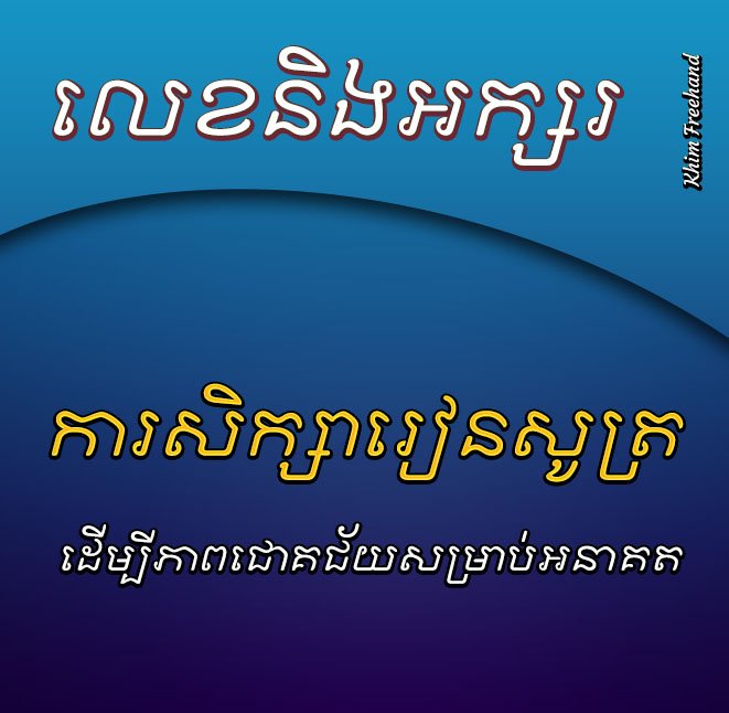 ពុម្ពអក្សរ Khim Freehand ត្រូវបានរចនាឡើងជាប្រភេទអក្សរដែល ដែលអាចប្រើប្រាស់បានតាមការគួរ ។ វាមានរៀងស្ដើងបន្តិចដែលអាចធ្វើការរចនាឬ Design ដោយការច្នៃប្រឌិត រំលេច Layer Style (ប្រសិនបើអ្នកប្រើប្រាស់ Photoshop, Illustrator) ឬមួយក៏ WordArt (ប្រសិនបើអ្នកប្រើប្រាស់ Microsoft Office) ។