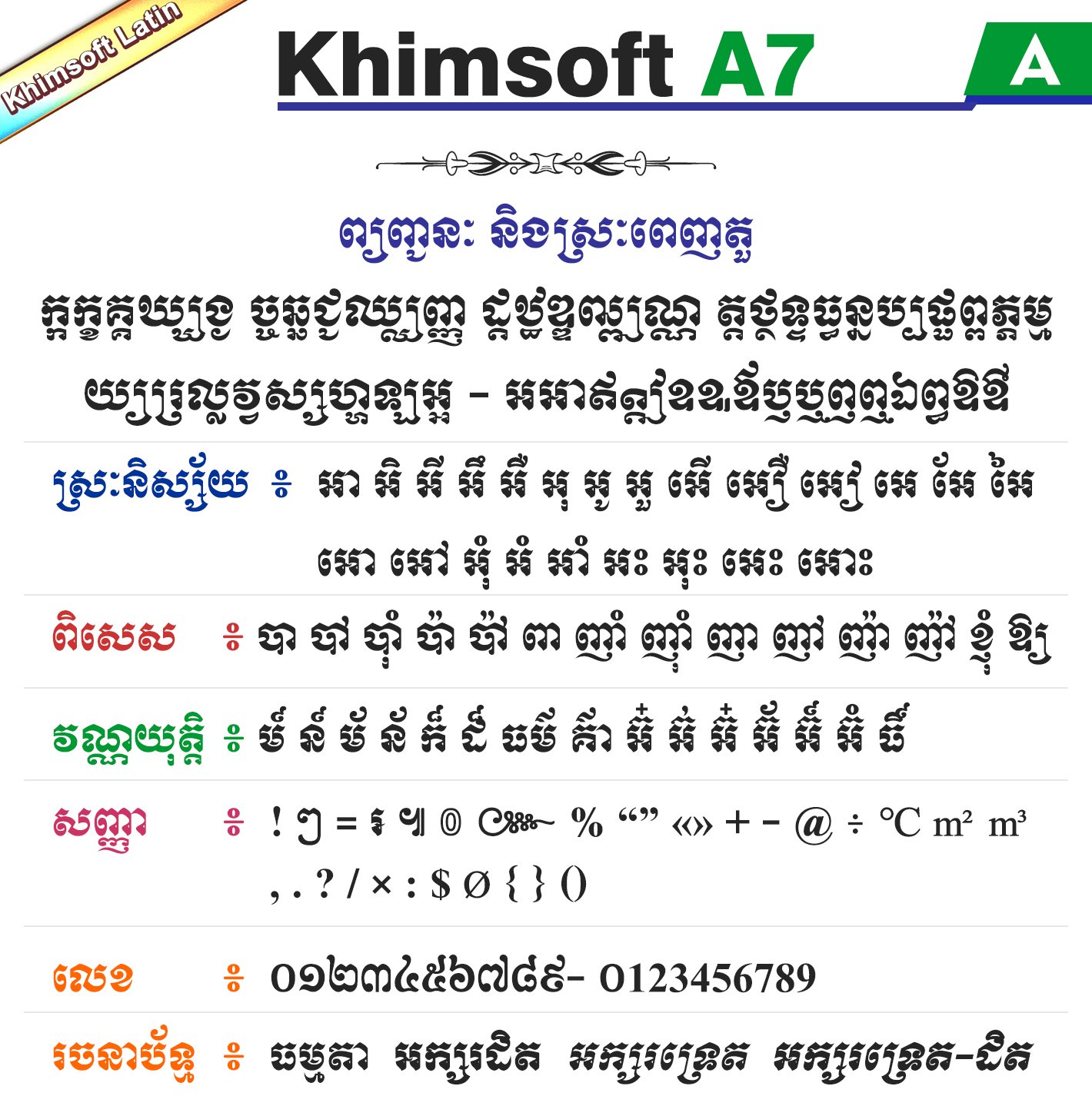 Khimsoft A7 ជាប្រភេទអក្សរ Khimsoft-Latin ដែលជាប្រភេទអក្សរដំណើរការដោយ Script ឬប្រភេទជាអក្សរឡាតាំង (មិនមែនជាយូនីកូដ) ដែលជាអក្សរមួយប្រភេទសម្រាប់ប្រើប្រាស់ជាមួយនឹងកិច្ចការទាំងឡាយណាដែលមិនគាំទ្រសម្រាប់អក្សរយូនីកូដ ។ ជាទូទៅអក្សរនេះអ្នកអាចប្រើជាមួយនឹងកម្មវិធីកាត់វីដេអូ ឬជាមួយនឹងកម្មវិធីក្រាហ្វិកដែលលំបាកក្នុងការប្រើប្រាស់អក្សរយូនីកូដក៏បាន ក្នុងនោះមានដូចជា AutoCAD, Sony Vegas, CNC Software ជាដើម ។