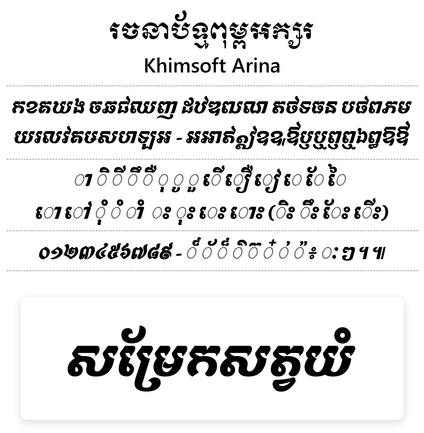 Khimsoft Arina ត្រូវបានរចនាឬបង្កើតឡើងនៅពេលដែលខ្ញុំបានស្ដាប់បទ “ផ្ការីកក្នុងសួនវណ្ណៈ” ដែលបានបកស្រាយដោយលោក សុះ ម៉ាច ហើយឈ្មោះនៃពុម្ពអក្សរនេះ គឺខ្ញុំបានដាក់តាមខ្ញុំនឹកគិតតែប៉ុណ្ណោះ មិនមែនដើម្បីនរណាម្នាក់ ឬមានអត្ថន័យផ្សេងឡើយ ។