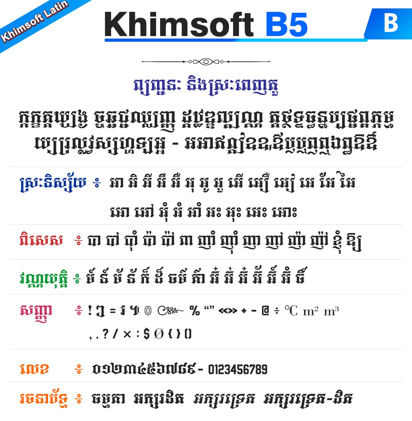 Khimsoft B5 ជាប្រភេទអក្សរ Khimsoft-Latin ដែលជាប្រភេទអក្សរដំណើរការដោយ Script ឬប្រភេទជាអក្សរឡាតាំង (មិនមែនជាយូនីកូដ) ដែលជាអក្សរមួយប្រភេទសម្រាប់ប្រើប្រាស់ជាមួយនឹងកិច្ចការទាំងឡាយណាដែលមិនគាំទ្រសម្រាប់អក្សរយូនីកូដ ។ ជាទូទៅអក្សរនេះអ្នកអាចប្រើជាមួយនឹងកម្មវិធីកាត់វីដេអូ ឬជាមួយនឹងកម្មវិធីក្រាហ្វិកដែលលំបាកក្នុងការប្រើប្រាស់អក្សរយូនីកូដក៏បាន ក្នុងនោះមានដូចជា AutoCAD, Sony Vegas, CNC Software ជាដើម ។