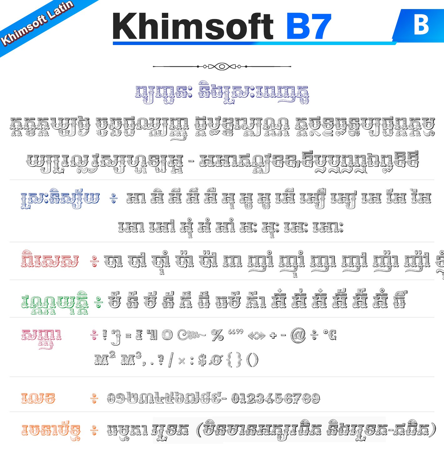 Khimsoft B7 ជាប្រភេទអក្សរ Khimsoft-Latin ដែលជាប្រភេទអក្សរដំណើរការដោយ Script ឬប្រភេទជាអក្សរឡាតាំង (មិនមែនជាយូនីកូដ) ដែលជាអក្សរមួយប្រភេទសម្រាប់ប្រើប្រាស់ជាមួយនឹងកិច្ចការទាំងឡាយណាដែលមិនគាំទ្រសម្រាប់អក្សរយូនីកូដ ។ ជាទូទៅអក្សរនេះអ្នកអាចប្រើជាមួយនឹងកម្មវិធីកាត់វីដេអូ ឬជាមួយនឹងកម្មវិធីក្រាហ្វិកដែលលំបាកក្នុងការប្រើប្រាស់អក្សរយូនីកូដក៏បាន ក្នុងនោះមានដូចជា AutoCAD, Sony Vegas, CNC Software ជាដើម ។