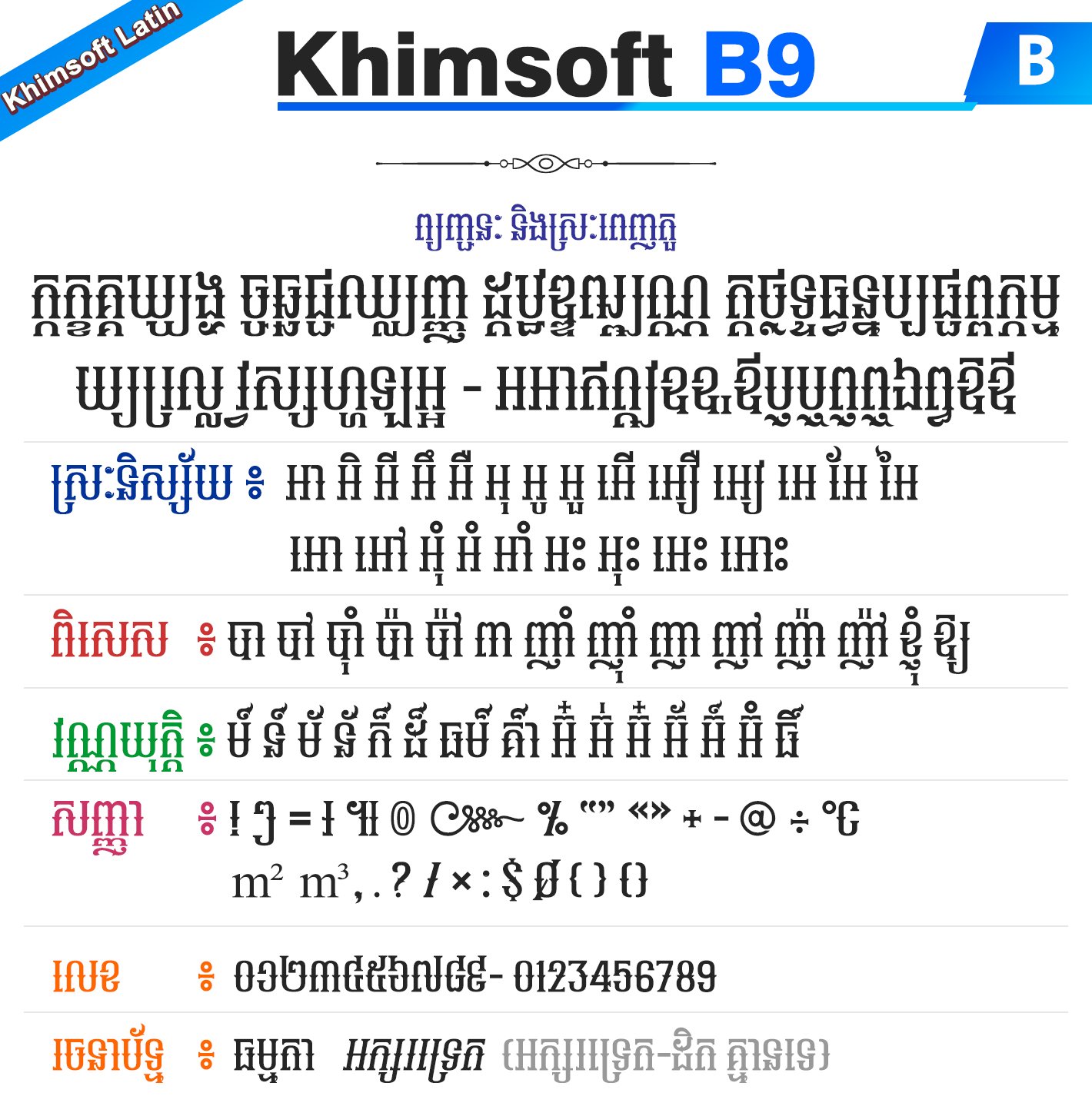 Khimsoft B9 ជាប្រភេទអក្សរ Khimsoft-Latin ដែលជាប្រភេទអក្សរដំណើរការដោយ Script ឬប្រភេទជាអក្សរឡាតាំង (មិនមែនជាយូនីកូដ) ដែលជាអក្សរមួយប្រភេទសម្រាប់ប្រើប្រាស់ជាមួយនឹងកិច្ចការទាំងឡាយណាដែលមិនគាំទ្រសម្រាប់អក្សរយូនីកូដ ។ ជាទូទៅអក្សរនេះអ្នកអាចប្រើជាមួយនឹងកម្មវិធីកាត់វីដេអូ ឬជាមួយនឹងកម្មវិធីក្រាហ្វិកដែលលំបាកក្នុងការប្រើប្រាស់អក្សរយូនីកូដក៏បាន ក្នុងនោះមានដូចជា AutoCAD, Sony Vegas, CNC Software ជាដើម ។