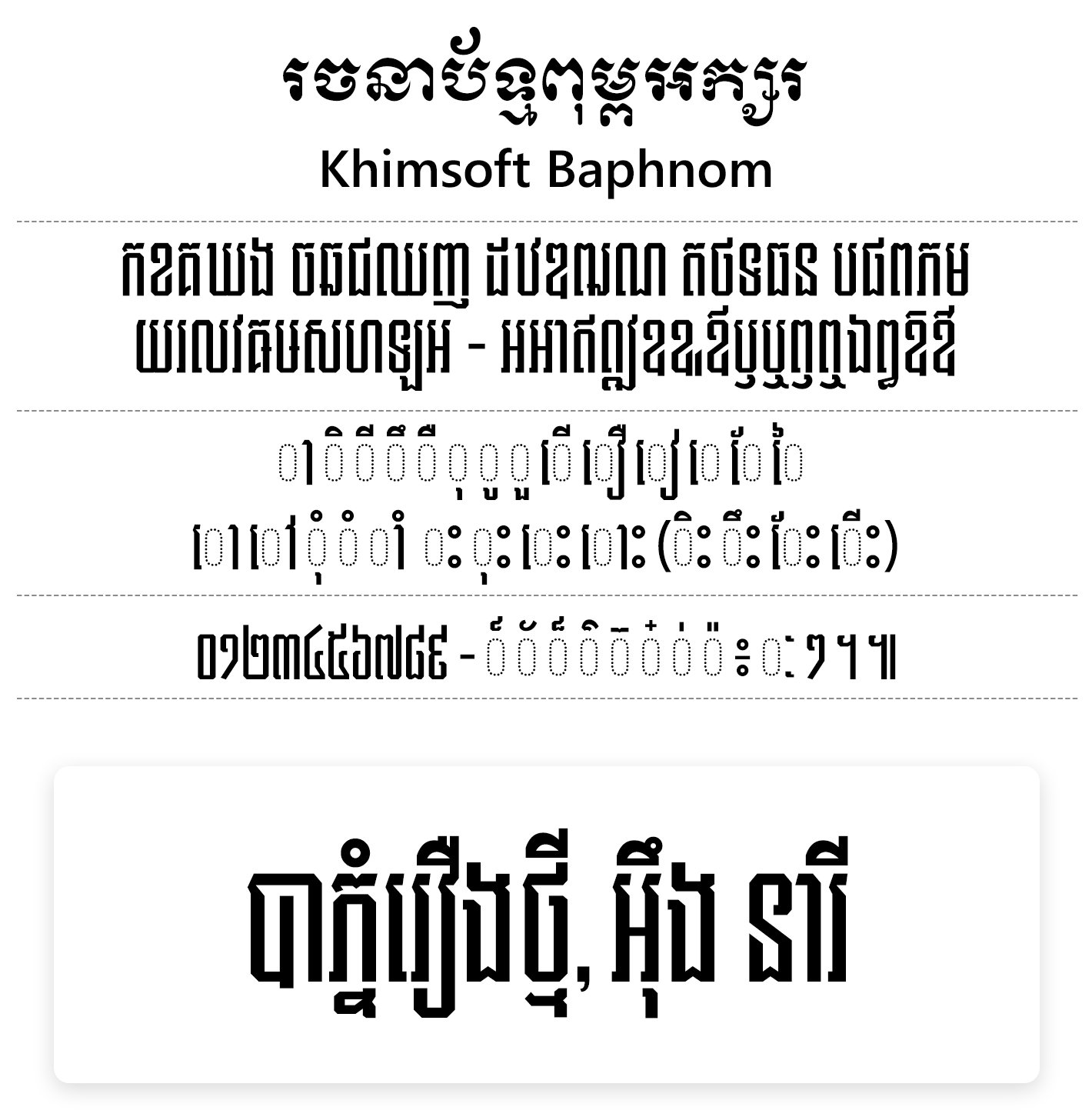 Khimsoft Baphnom ត្រូវបានបង្កើតឡើងតាមរយៈបទចម្រៀង “ឈើកាច់បាភ្នំ” ដែលបានបកស្រាយដោយលោក អ៊ឹង ណារី ។ អក្សរនេះខ្ញុំបាន Designed វាឡើងដោយគិតថាវាងាយស្រួលប្រើក្នុងបរិបទតូចចង្អៀតនៃសន្លឹកកិច្ចការដូចជាសរសេរក្នុងកម្មវិធីទូរទស្សន៍ ខិតប័ណ្ណផ្សេងៗ ទើបការរចនាឱ្យមានកម្ពស់ខ្ពស់ហើយញឹក ដើម្បីកុំឱ្យខាតកន្លែងឬកុំឱ្យស៊ី Space ច្រើន ។ ចំពោះឈ្មោះពុម្ពអក្សរនេះគឺយកតាមខ្លឹមសារនៃបទចម្រៀងត្រង់ “បាភ្នំ” ។