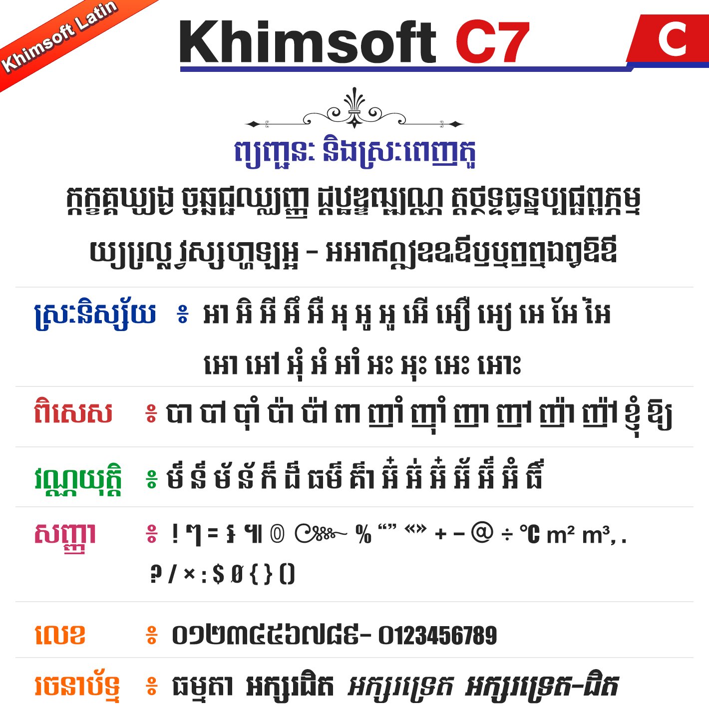 Khimsoft C7 ជាប្រភេទអក្សរ Khimsoft-Latin ដែលជាប្រភេទអក្សរដំណើរការដោយ Script ឬប្រភេទជាអក្សរឡាតាំង (មិនមែនជាយូនីកូដ) ដែលជាអក្សរមួយប្រភេទសម្រាប់ប្រើប្រាស់ជាមួយនឹងកិច្ចការទាំងឡាយណាដែលមិនគាំទ្រសម្រាប់អក្សរយូនីកូដ ។ ជាទូទៅអក្សរនេះអ្នកអាចប្រើជាមួយនឹងកម្មវិធីកាត់វីដេអូ ឬជាមួយនឹងកម្មវិធីក្រាហ្វិកដែលលំបាកក្នុងការប្រើប្រាស់អក្សរយូនីកូដក៏បាន ក្នុងនោះមានដូចជា AutoCAD, Sony Vegas, CNC Software ជាដើម ។