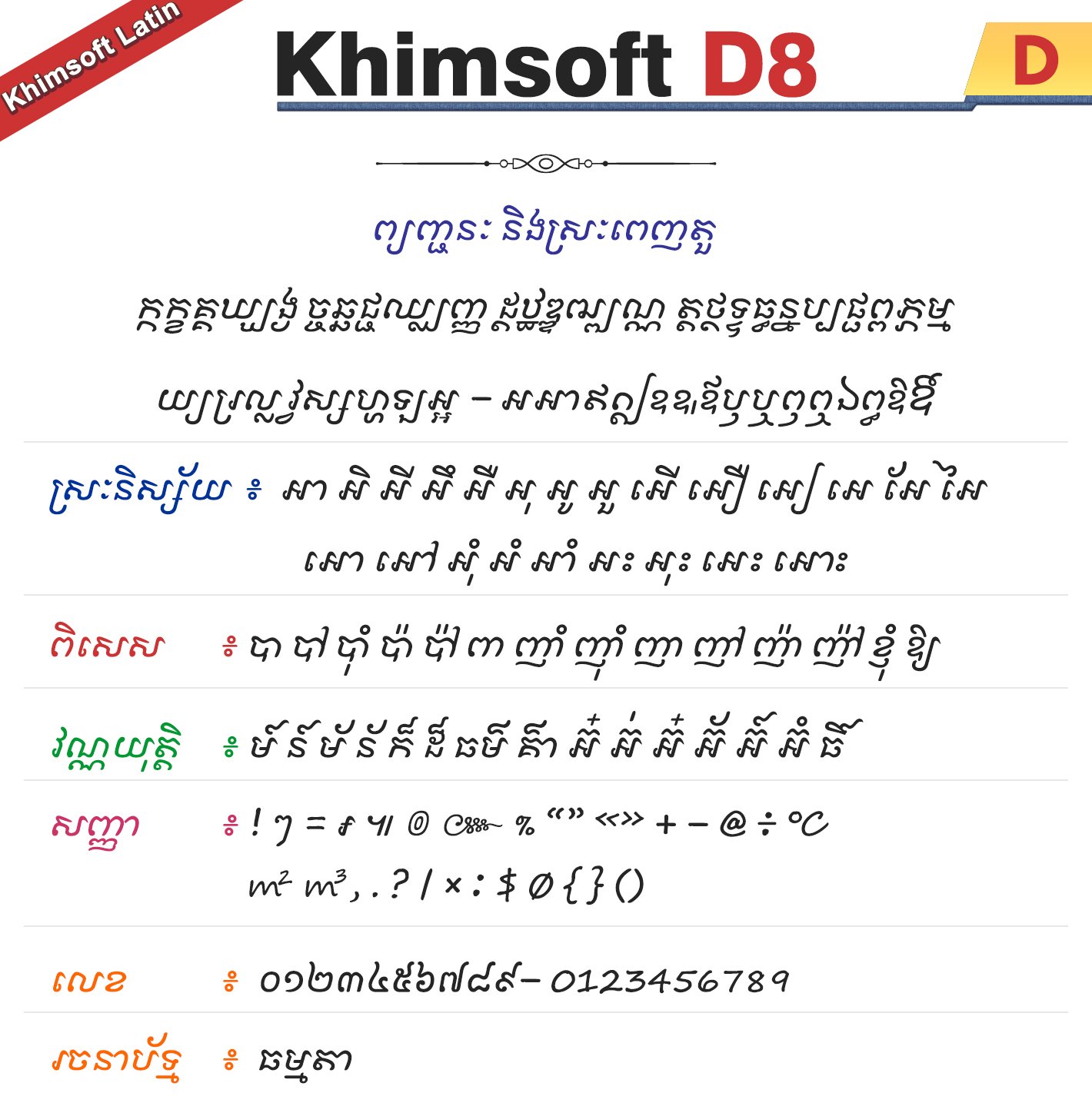 Khimsoft D8 ជាប្រភេទអក្សរ Khimsoft-Latin ដែលជាប្រភេទអក្សរដំណើរការដោយ Script ឬប្រភេទជាអក្សរឡាតាំង (មិនមែនជាយូនីកូដ) ដែលជាអក្សរមួយប្រភេទសម្រាប់ប្រើប្រាស់ជាមួយនឹងកិច្ចការទាំងឡាយណាដែលមិនគាំទ្រសម្រាប់អក្សរយូនីកូដ ។ ជាទូទៅអក្សរនេះអ្នកអាចប្រើជាមួយនឹងកម្មវិធីកាត់វីដេអូ ឬជាមួយនឹងកម្មវិធីក្រាហ្វិកដែលលំបាកក្នុងការប្រើប្រាស់អក្សរយូនីកូដក៏បាន ក្នុងនោះមានដូចជា AutoCAD, Sony Vegas, CNC Software ជាដើម ។