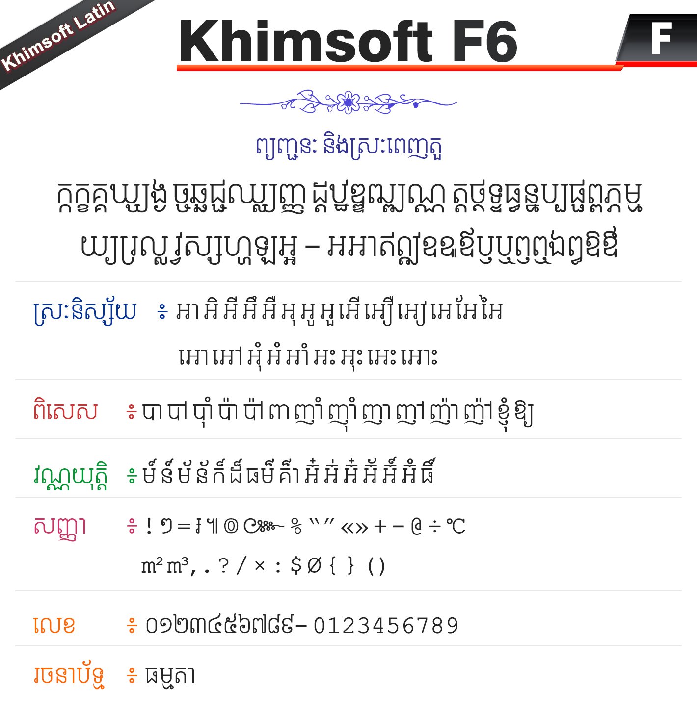Khimsoft F6 ជាប្រភេទអក្សរ Khimsoft-Latin ដែលជាប្រភេទអក្សរដំណើរការដោយ Script ឬប្រភេទជាអក្សរឡាតាំង (មិនមែនជាយូនីកូដ) ដែលជាអក្សរមួយប្រភេទសម្រាប់ប្រើប្រាស់ជាមួយនឹងកិច្ចការទាំងឡាយណាដែលមិនគាំទ្រសម្រាប់អក្សរយូនីកូដ ។ ជាទូទៅអក្សរនេះអ្នកអាចប្រើជាមួយនឹងកម្មវិធីកាត់វីដេអូ ឬជាមួយនឹងកម្មវិធីក្រាហ្វិកដែលលំបាកក្នុងការប្រើប្រាស់អក្សរយូនីកូដក៏បាន ក្នុងនោះមានដូចជា AutoCAD, Sony Vegas, CNC Software ជាដើម ។