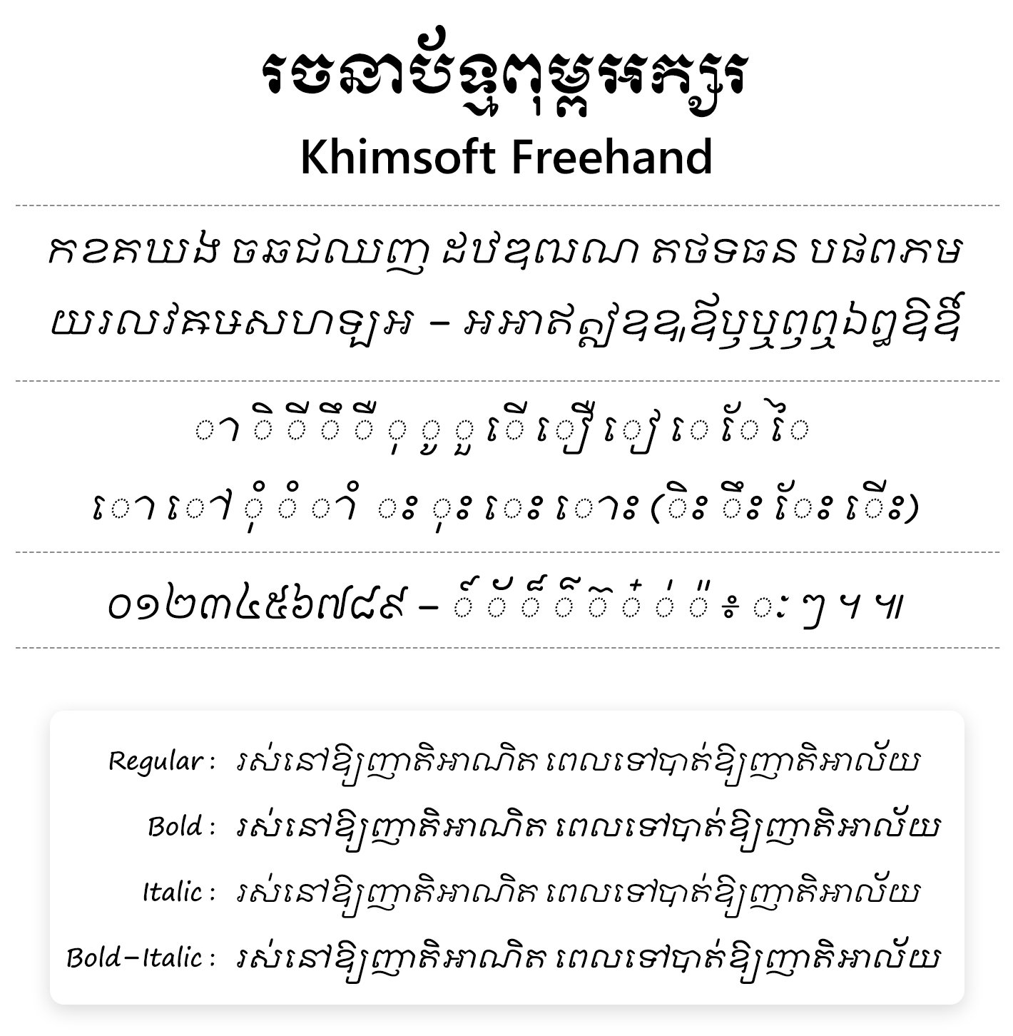 ពុម្ពអក្សរ Khimsoft Freehand អក្សរនេះត្រូវបានបង្កើតឡើងក្រោយពុម្ពអក្សរ Cambodia Script ។ ប្រភេទអក្សរ Khimsoft Freehand មានរៀងទ្រេតស្រដៀងនឹង Cambodia Script ដែរ ប៉ុន្តែវារៀងស្ដើងជាង និងសក់អក្សរខ្លីជាងបន្តិច ព្រមទាំងបច្ចេកសក់អក្សរមួយចំនួនខុសគ្នា ។