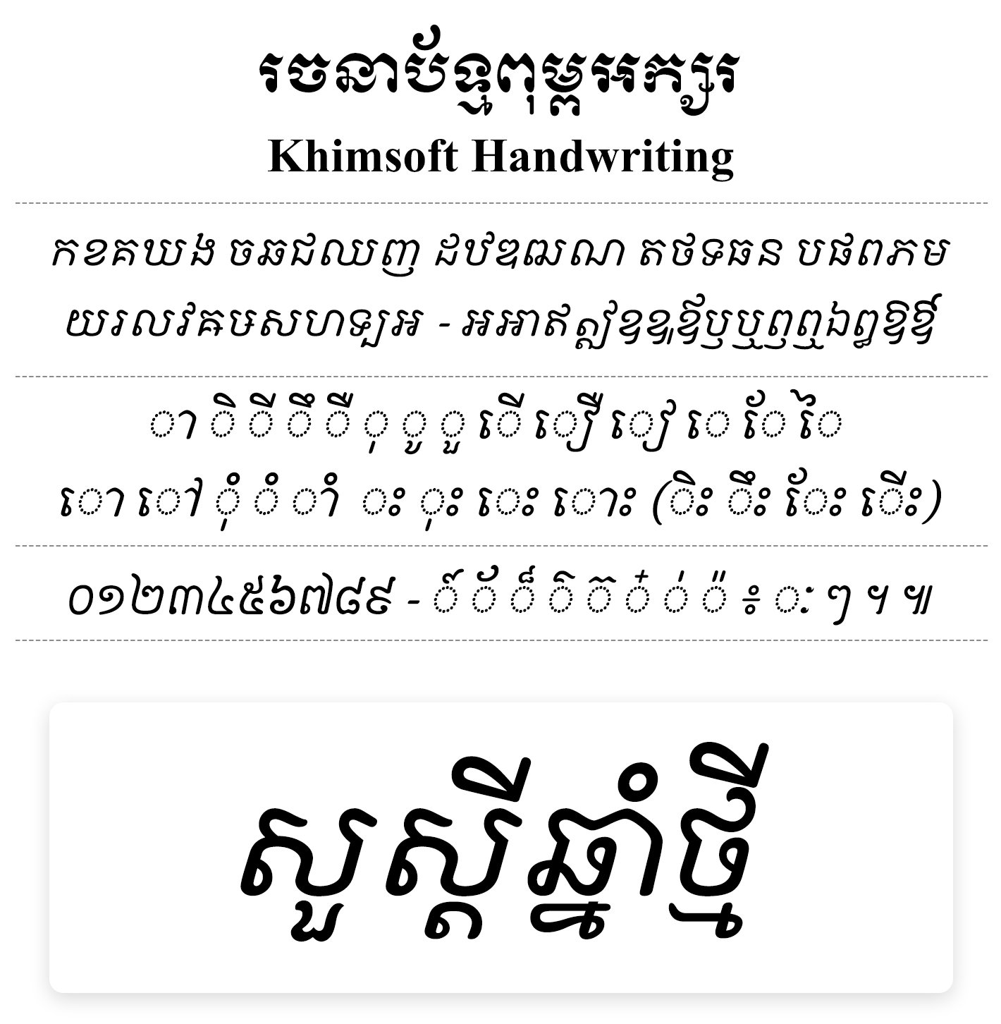 ពុម្ពអក្សរ Khimsoft Handwriting ត្រូវបានរចនាឡើងជាប្រភេទអក្សរដែល ដែលអាចប្រើប្រាស់បានតាមការគួរ ។ វាមានរៀងស្ដើងបន្តិចដែលអាចធ្វើការរចនាឬ Design ដោយការច្នៃប្រឌិត រំលេច Layer Style (ប្រសិនបើអ្នកប្រើប្រាស់ Photoshop, Illustrator) ឬមួយក៏ WordArt (ប្រសិនបើអ្នកប្រើប្រាស់ Microsoft Office) ។