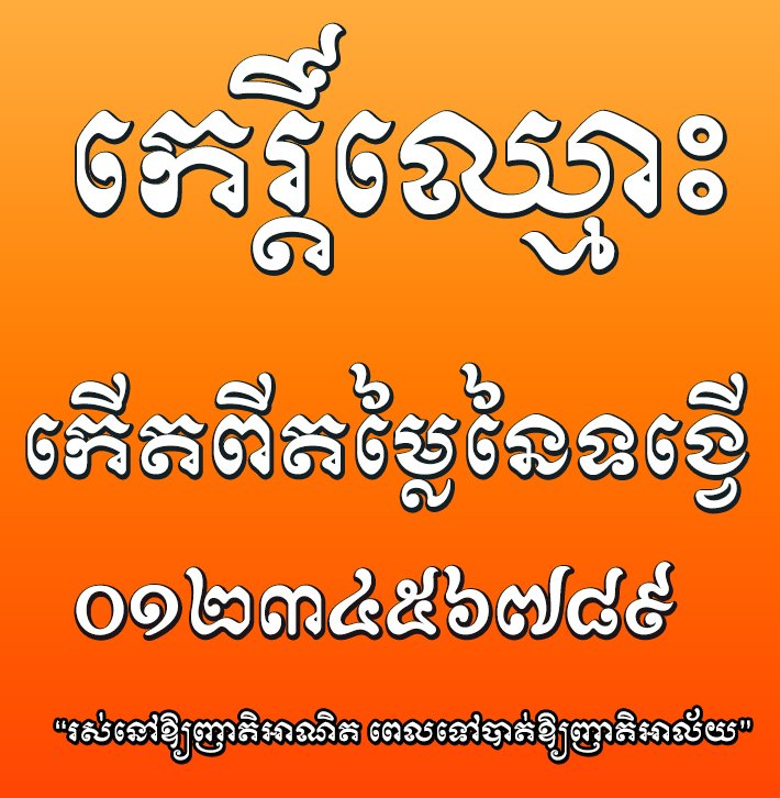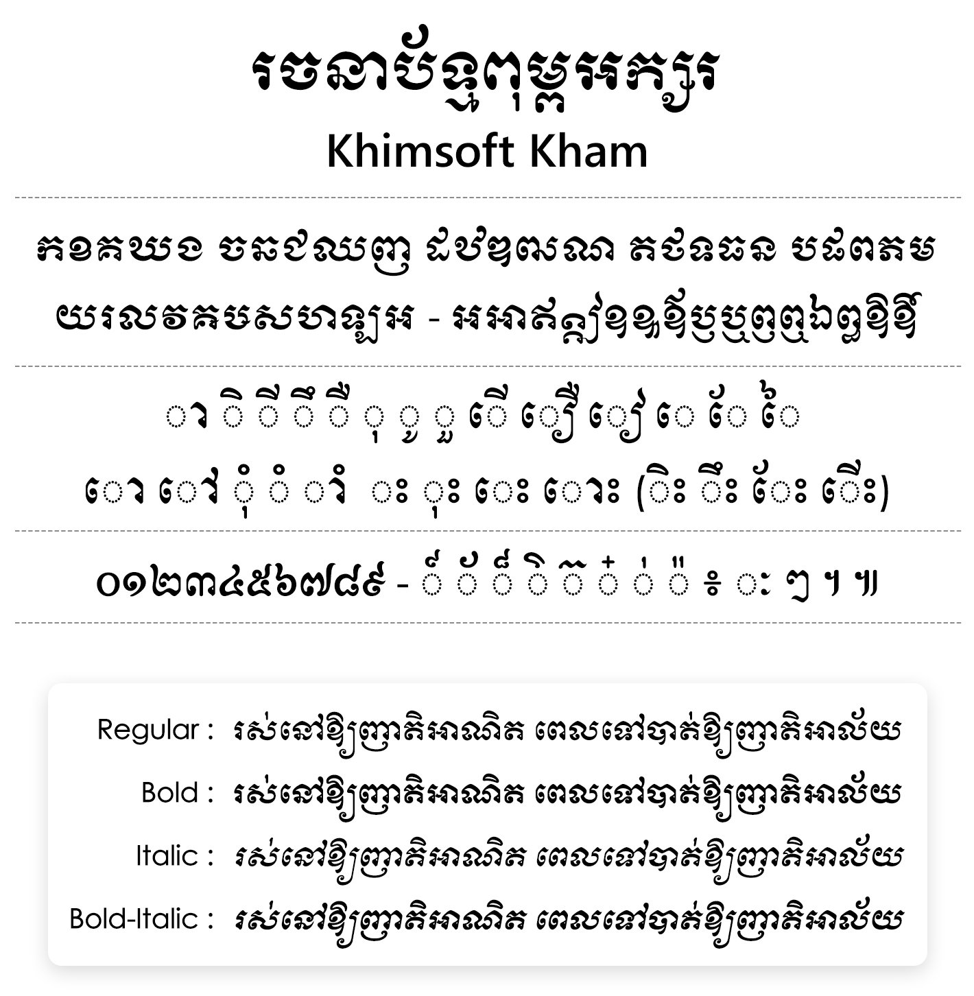 ដ្បិតថាអក្សរនេះមិនចំជាអក្សរខម ១០០% ប៉ុន្តែវាជាឈ្មោះដែលយើងបានសន្មត់ទៅហើយ ។ Khimsoft Kham ត្រូវបានបង្កើតឡើងដែលមានពីរប្រភេទ គឺ Khimsoft Kham Letters និង Khimsoft Kham តែអក្សរ Khimsoft Kham ត្រូវបានរចនាក្រោយអក្សរ Khimsoft Kham Letters ។ យើងបានបង្កើតឱ្យមានអក្សរ Family ពេញលេញសម្រាប់ប្រើប្រាស់តាមការដែលអាចប្រើប្រាស់ទៅបាន ពោលគឺអាស្រ័យលើអ្នកជ្រើសរើសមកប្រើប៉ុណ្ណោះ ។ សូមមើលក្នុងបរិយាយខ្លី (Product short description) បន្ថែមទៀត ។