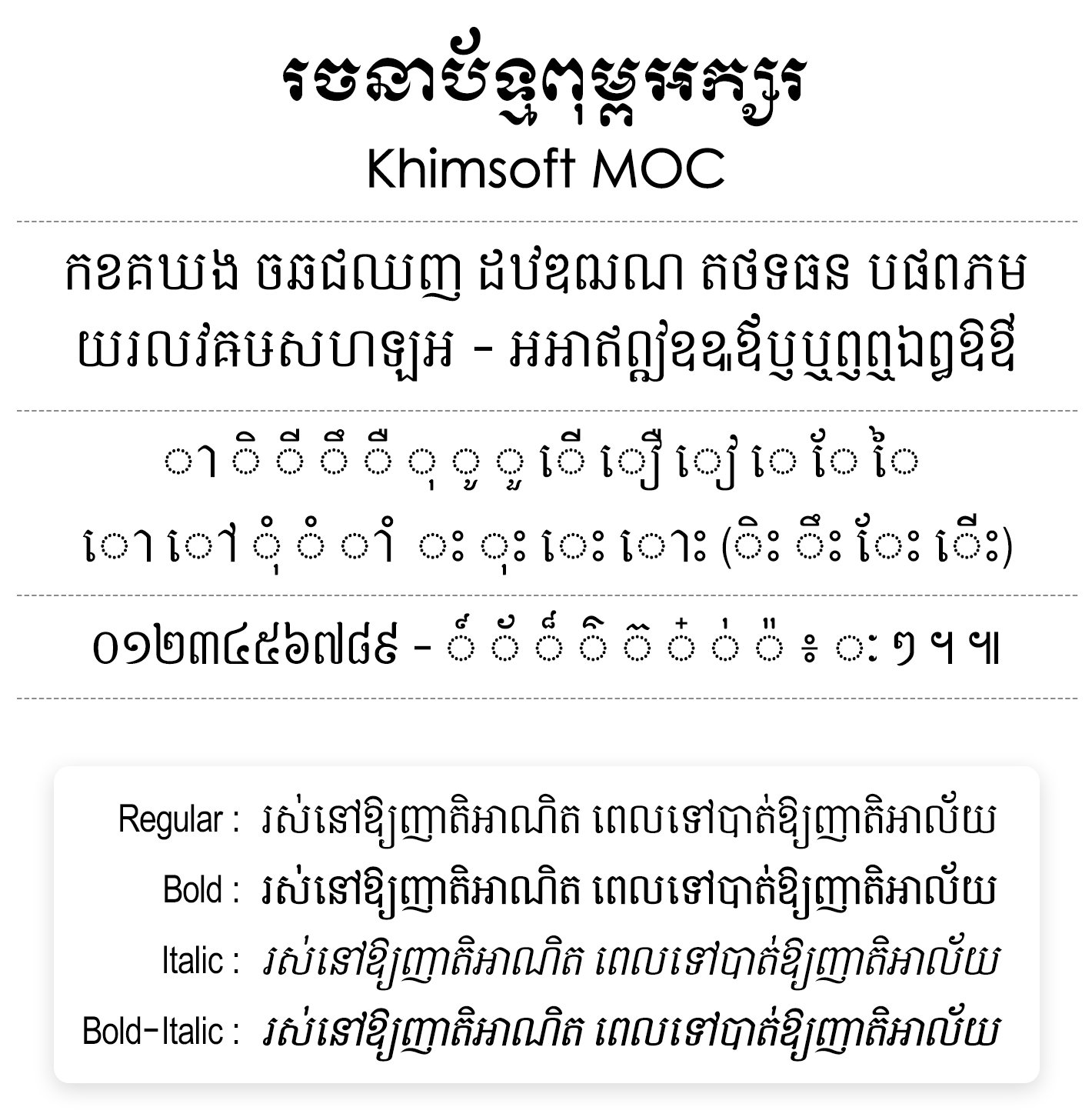 Khimsoft MOC ត្រូវបានបង្កើតឡើងសម្រាប់ក្រសួងពាណិជ្ជកម្ម ។ ការរចនាត្រូវបានធ្វើឡើងតាមការរៀបចំរបស់ Khimsoft តែប៉ុណ្ណោះ វាមិនមែនជាការផ្ដល់នូវអនុសាសន៍ឬស្នើសុំណាមួយពីអង្គភាពសាមីឡើយ ហើយអក្សរទាំងនេះអាចនឹងមានការប្រែប្រួលឬធ្វើបច្ចុប្បន្នភាព ដែលជាហេតុធ្វើឱ្យតំណចាស់អាចនឹងត្រូវបានលុបចេញ តែយ៉ាងណាគ្រប់ពុម្ពអក្សរទាំងនោះ យើងខ្ញុំនៅតែរក្សាក្នុងបញ្ជីពុម្ពអក្សរតាមស្ថាប័នឬក្រសួងនោះដដែល ។