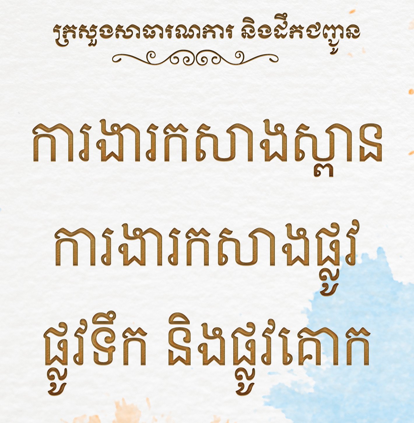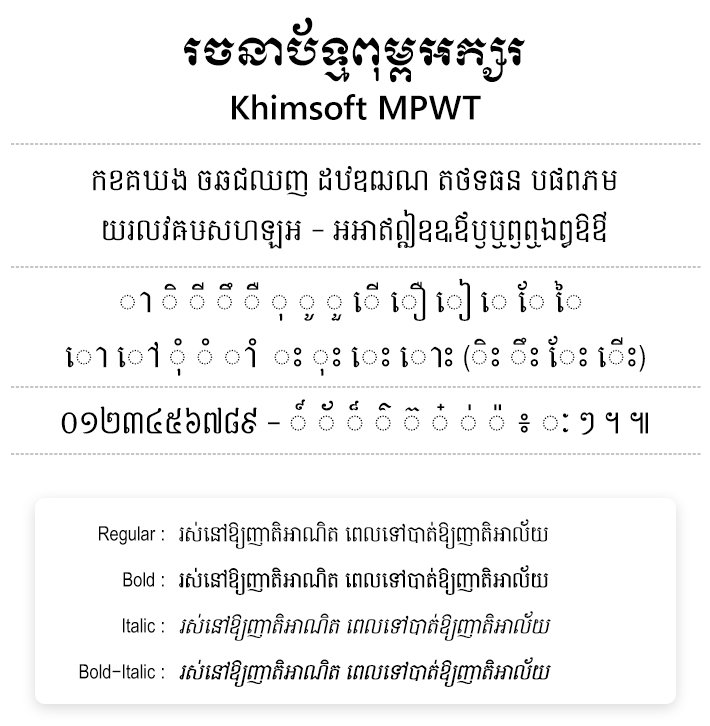 Khimsoft MPWT ត្រូវបានបង្កើតឡើងសម្រាប់ក្រសួងសាធារណការ និងដឹកជញ្ជូន ។ ការរចនាត្រូវបានធ្វើឡើងតាមការរៀបចំរបស់ Khimsoft តែប៉ុណ្ណោះ វាមិនមែនជាការផ្ដល់នូវអនុសាសន៍ឬស្នើសុំណាមួយពីអង្គភាពសាមីឡើយ ហើយអក្សរទាំងនេះអាចនឹងមានការប្រែប្រួលឬធ្វើបច្ចុប្បន្នភាព ដែលជាហេតុធ្វើឱ្យតំណចាស់អាចនឹងត្រូវបានលុបចេញ តែយ៉ាងណាគ្រប់ពុម្ពអក្សរទាំងនោះ យើងខ្ញុំនៅតែរក្សាក្នុងបញ្ជីពុម្ពអក្សរតាមស្ថាប័នឬក្រសួងនោះដដែល ។