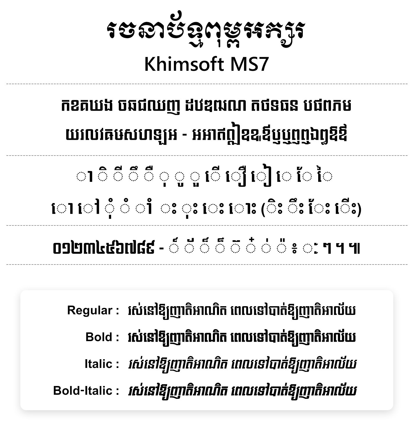 ពុម្ពអក្សរ Khimsoft MS7 គឺជាប្រភេទអក្សរឆ្លាក់មួយប្រភេទ ដែលមិនយកតាមលំនាំអក្សរឆ្លាក់ត្រកូល MS មុនៗទេ ។ អក្សរនេះបានរចនាឡើងឱ្យមានទាំងធម្មតា ទ្រេត ដិត ដិតហើយទ្រេត ប៉ុន្តែសម្រាប់មាតិកាយើងមិនបង្កើតនោះទេ ។