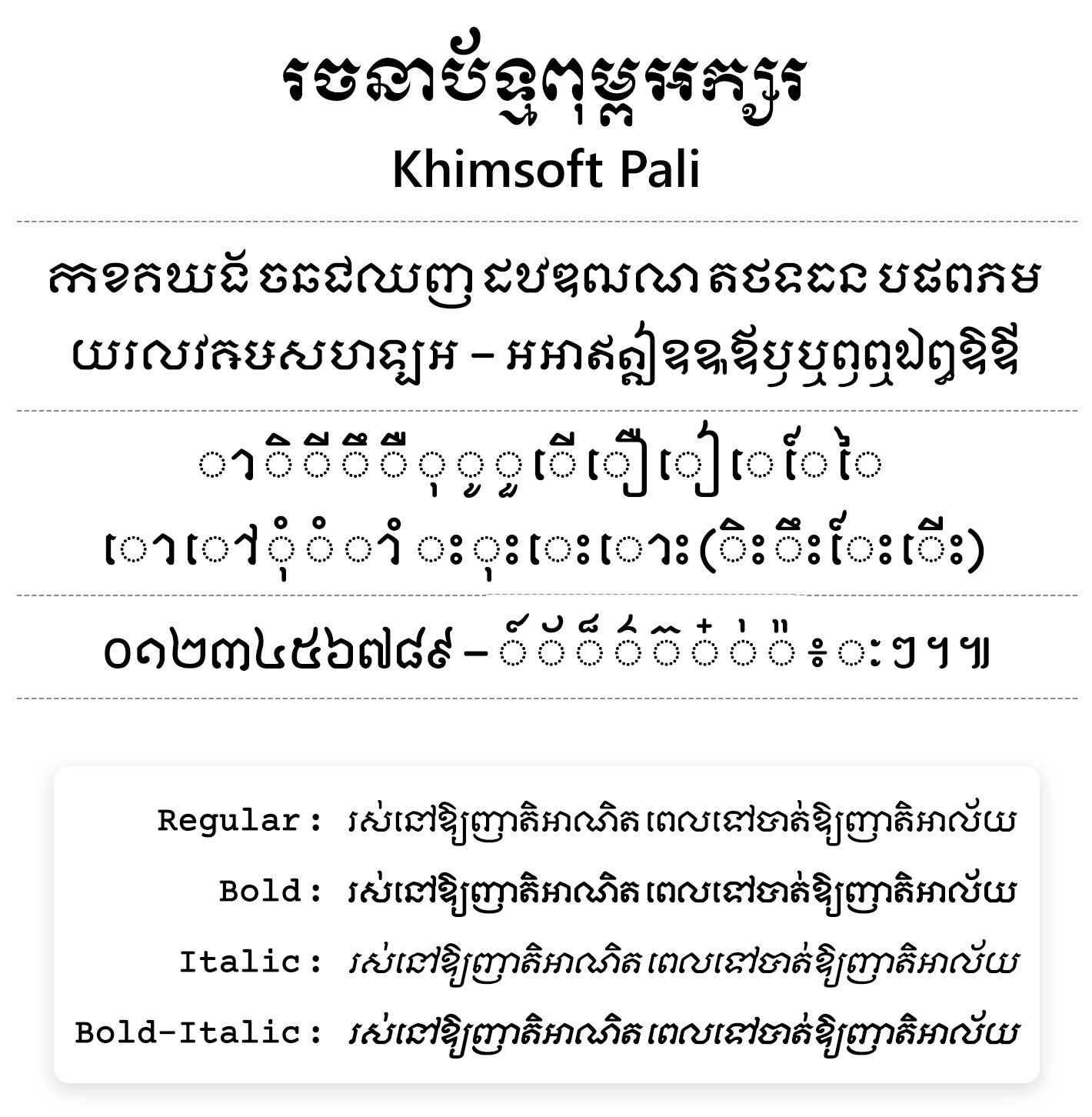 ដើមឡើយខ្ញុំគិតថាមិនធ្វើពុម្ពអក្សរ Khimsoft Pali  នោះទេ ព្រោះថាវាលំបាកក្នុងការ Design ពេក ហើយលុះខ្ញុំធ្វើអក្សរប្រមាណជាង ៩០០ ហើយទើបសម្រេចចិត្តធ្វើពុម្ពអក្សរមួយនេះ ។ អក្សរនេះត្រូវបានរចនាថ្មី ។ អក្សរនេះរាងក្រាស់ជាងពុម្ពអក្សរ Khmer OS Muol Pali នេះបើប្រៀបធៀបគ្នា ហើយនឹងញឹកជាង ប៉ុន្តែ Khimsoft Pali ជាទម្រង់មួយបែបផ្សេង អ្វីដែលពិសេសគឺអក្សរនេះមានគ្រប់គ្រាន់សម្រាប់ប្រើប្រាស់ដូចជា Regular, Bold, Italic និង Bold-Italic ដែលនឹងធ្វើឱ្យអត្ថបទឬកិច្ចការដែលសរសេរចេញពីអក្សរនេះមើលទៅសមរម្យ ចន្លោះរបស់វាមិនសូវរង្វើលពេកទេ ។