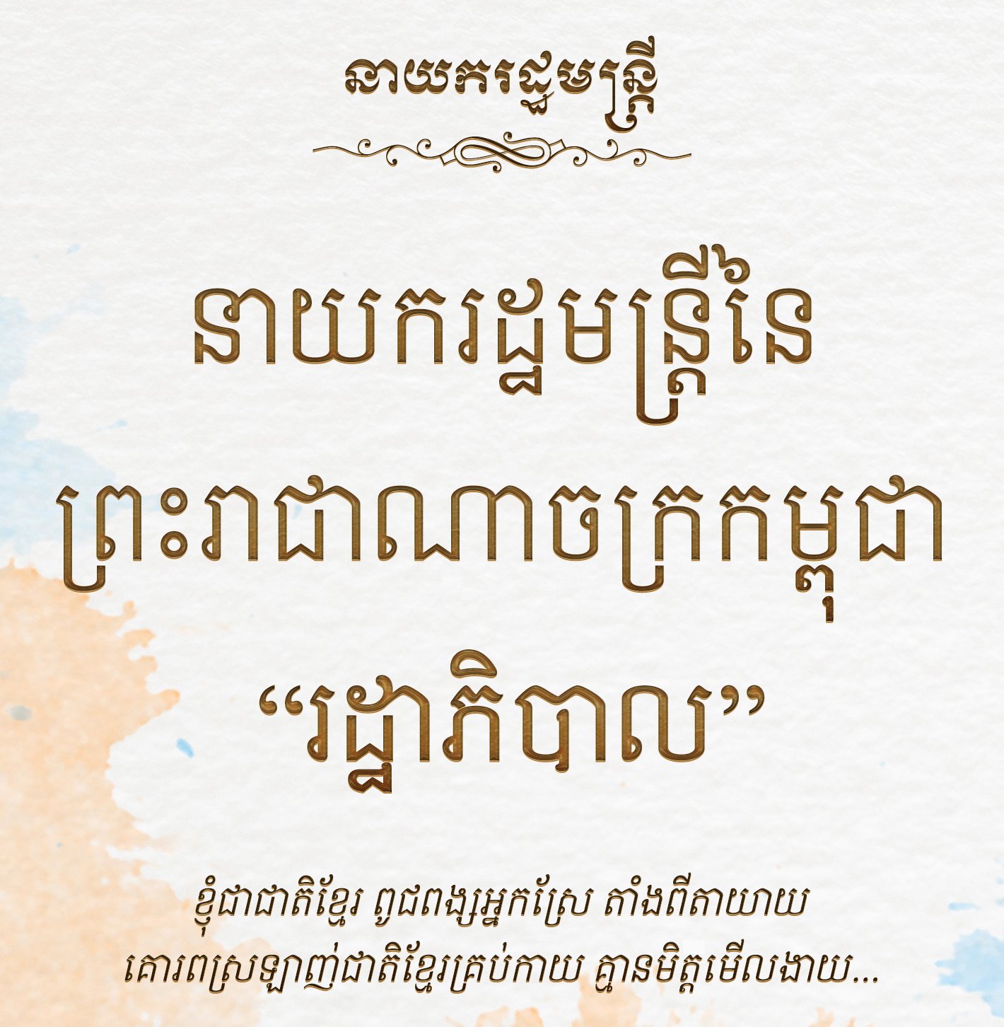 Khimsoft Prime Minister ត្រូវបានបង្កើតឡើងសម្រាប់នាយករដ្ឋមន្រ្តី នៃ ព្រះរាជាណាចក្រកម្ពុជា ។ ការរចនាត្រូវបានធ្វើឡើងតាមការរៀបចំរបស់ Khimsoft តែប៉ុណ្ណោះ វាមិនមែនជាការផ្ដល់នូវអនុសាសន៍ឬស្នើសុំណាមួយពីអង្គភាពសាមីឡើយ ហើយអក្សរទាំងនេះអាចនឹងមានការប្រែប្រួលឬធ្វើបច្ចុប្បន្នភាព ដែលជាហេតុធ្វើឱ្យតំណចាស់អាចនឹងត្រូវបានលុបចេញ តែយ៉ាងណាគ្រប់ពុម្ពអក្សរទាំងនោះ យើងខ្ញុំនៅតែរក្សាក្នុងបញ្ជីពុម្ពអក្សរតាមស្ថាប័នឬក្រសួងនោះដដែល ។