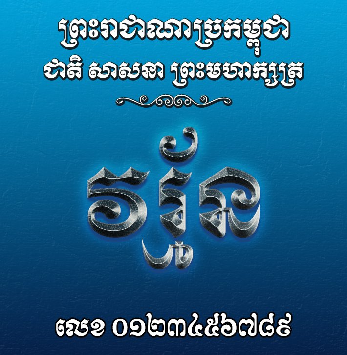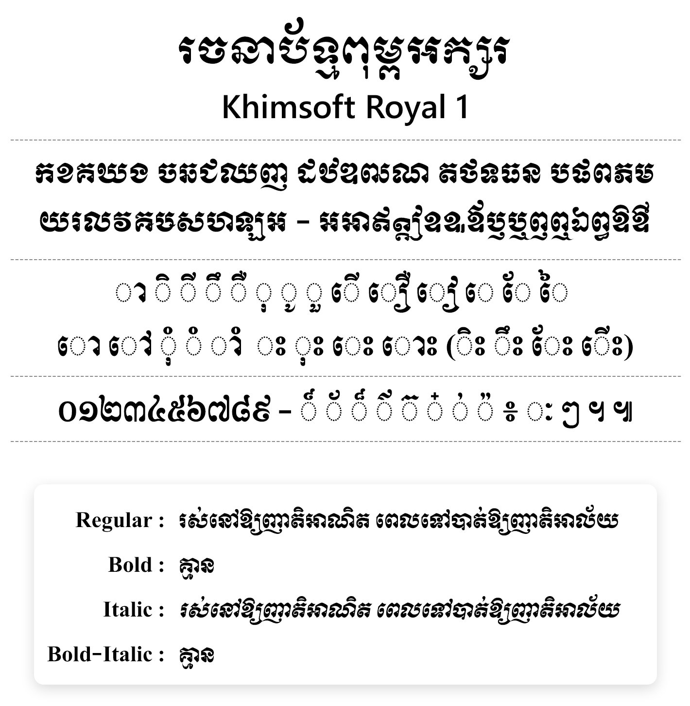 ពុម្ពអក្សរមូល Khimsoft Royal 1 ត្រូវបានរចនាឡើងសម្រាប់ប្រើប្រាស់លើចំណងជើង និងឃ្លាឃ្លោងផ្សេងៗដែលអ្នកត្រូវការ ។ វាមិនមែនជាអក្សរដែលរចនាឡើងសម្រាប់ព្រះមហាក្សត្រនោះទេ ប៉ុន្តែវាជាឈ្មោះដែលបានកំណត់សម្រាប់ប្រើប្រាស់ជាផ្លូវការដោយអ្នក Design ។ អក្សរនេះបើអ្នកចង់បានឱ្យដូរលេខពីឡាតាំងមកខ្មែរ ត្រូវរើសយកពុម្ពអក្សរមួយទៀតគឺ Khimsoft Royal 1 Khmer ដែលមានស្រាប់ក្នុងកញ្ចប់ (Zip) នៅពេលអ្នកបានទិញហើយកុំភ្លេចដំឡើងវាផង ។