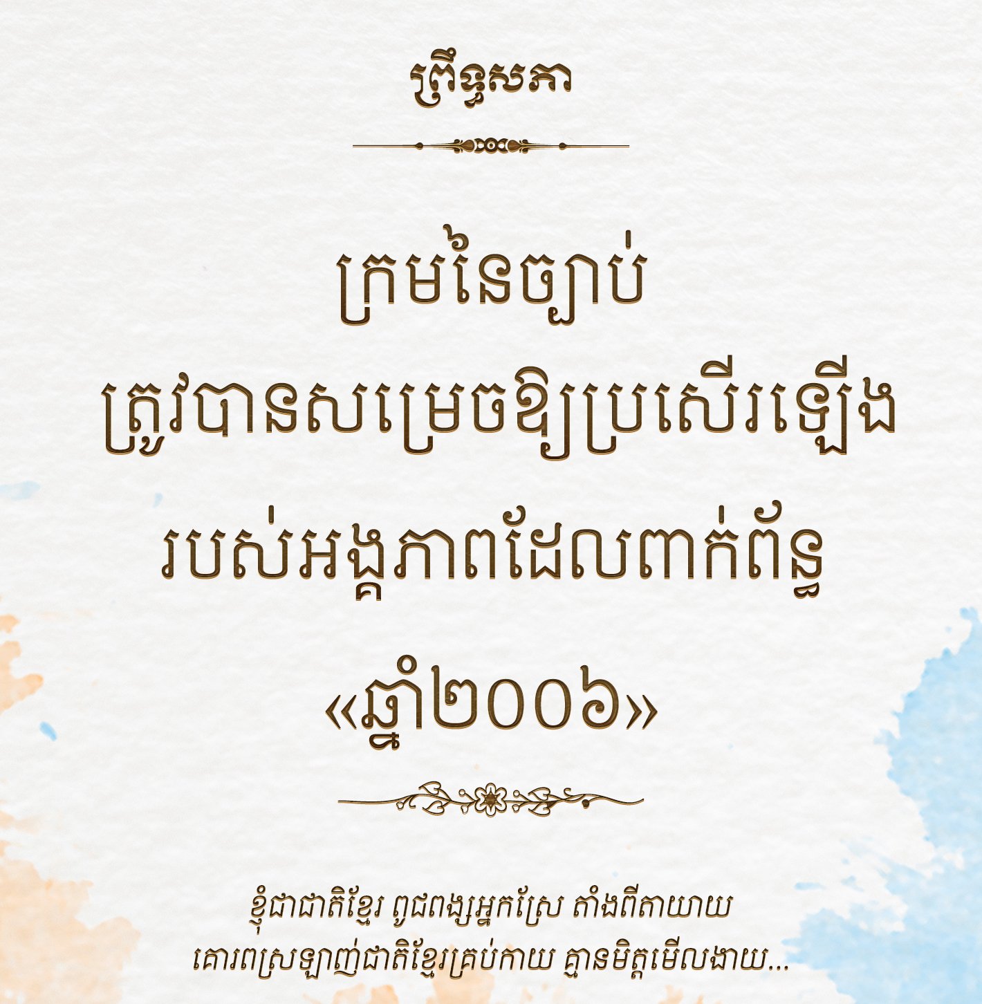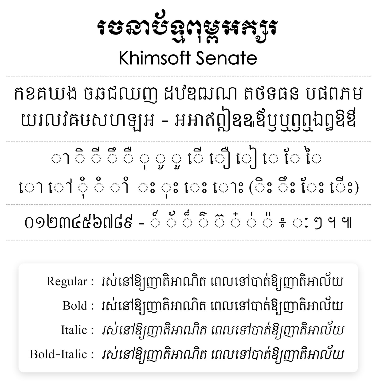 Khimsoft Senate ត្រូវបានបង្កើតឡើងសម្រាប់ព្រឹទ្ធសភា នៃ ព្រះរាជាណាចក្រកម្ពុជា ។ ការរចនាត្រូវបានធ្វើឡើងតាមការរៀបចំរបស់ Khimsoft តែប៉ុណ្ណោះ វាមិនមែនជាការផ្ដល់នូវអនុសាសន៍ឬស្នើសុំណាមួយពីអង្គភាពសាមីឡើយ ហើយអក្សរទាំងនេះអាចនឹងមានការប្រែប្រួលឬធ្វើបច្ចុប្បន្នភាព ដែលជាហេតុធ្វើឱ្យតំណចាស់អាចនឹងត្រូវបានលុបចេញ តែយ៉ាងណាគ្រប់ពុម្ពអក្សរទាំងនោះ យើងខ្ញុំនៅតែរក្សាក្នុងបញ្ជីពុម្ពអក្សរតាមស្ថាប័នឬក្រសួងនោះដដែល ។