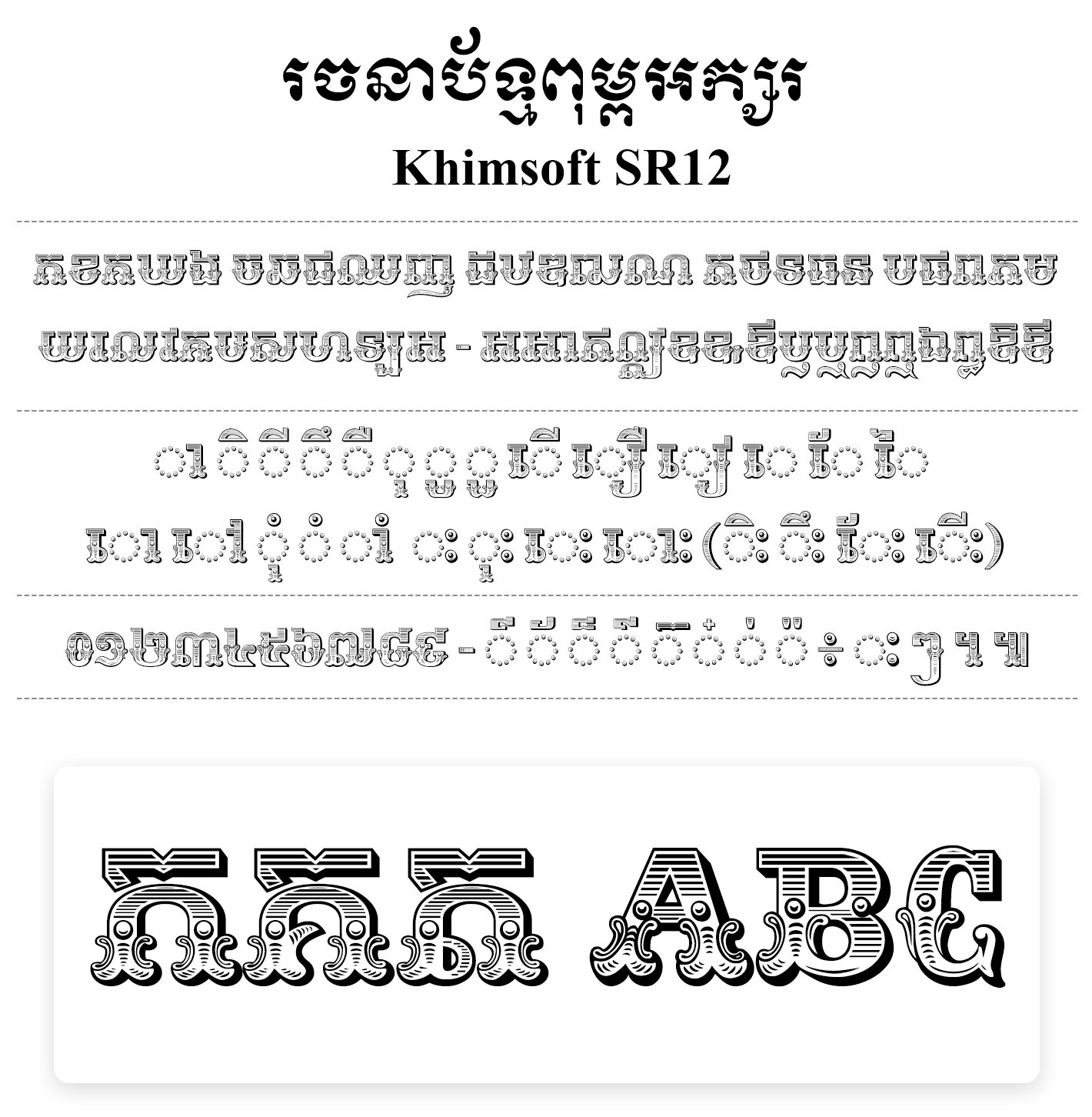 Khimsoft SR12 ជាប្រភេទពុម្ពអក្សរដែលចំណាយពេលយូរបំផុតមួយក្នុងការចំណាយពេលវេលា Design បូករួមទាំងការសម្រួលបច្ចេកទេសទាំងភាសាខ្មែរ និងភាសាអង់គ្លេស បូករួមទាំងការបន្ថែម Code ដើម្បីឱ្យដំណើរការបានប្រសើរឡើង ។ ទាំងព្យញ្ជនៈ និងលេខខ្មែរត្រូវបានរចនាពេញលេញ រួមទាំងអាចប្រើប្រាស់បានជាលក្ខណៈទូទៅសម្រាប់ Unicode ។