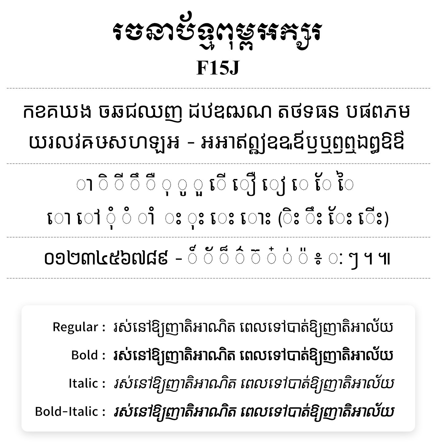 ពុម្ពអក្សរ F15J ត្រូវបានរចនាឡើងក្នុងគោលបំណងប្រើប្រាស់តាមការគួរ ។ អ្នកអាចធ្វើការរចនាឬ Design ដោយការច្នៃប្រឌិត រំលេច Layer Style (ប្រសិនបើអ្នកប្រើប្រាស់ Photoshop, Illustrator) ឬមួយក៏ WordArt (ប្រសិនបើអ្នកប្រើប្រាស់ Microsoft Office) ។