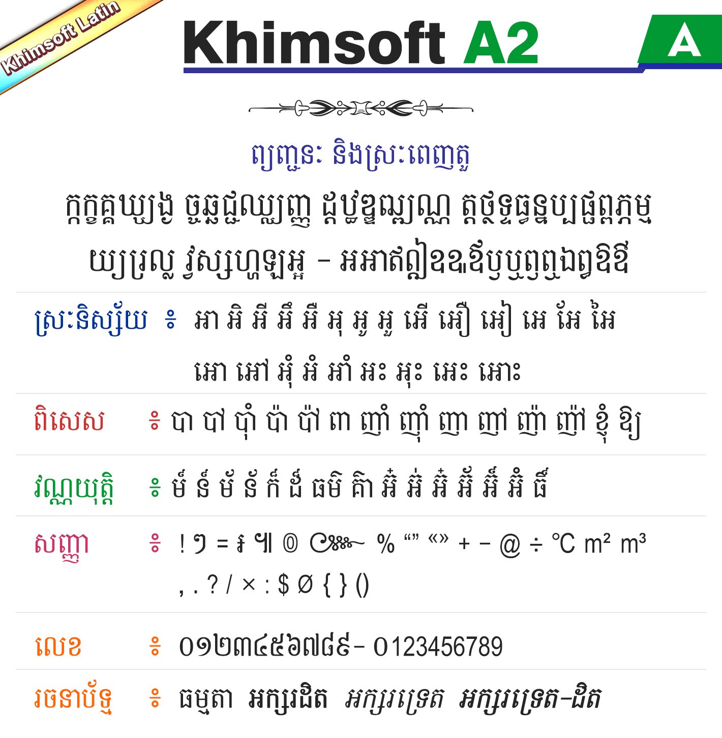 Khimsoft A2 ជាប្រភេទអក្សរ Khimsoft-Latin ដែលជាប្រភេទអក្សរដំណើរការដោយ Script ឬប្រភេទជាអក្សរឡាតាំង (មិនមែនជាយូនីកូដ) ដែលជាអក្សរមួយប្រភេទសម្រាប់ប្រើប្រាស់ជាមួយនឹងកិច្ចការទាំងឡាយណាដែលមិនគាំទ្រសម្រាប់អក្សរយូនីកូដ ។ ជាទូទៅអក្សរនេះអ្នកអាចប្រើជាមួយនឹងកម្មវិធីកាត់វីដេអូ ឬជាមួយនឹងកម្មវិធីក្រាហ្វិកដែលលំបាកក្នុងការប្រើប្រាស់អក្សរយូនីកូដក៏បាន ក្នុងនោះមានដូចជា AutoCAD, Sony Vegas, CNC Software ជាដើម ។