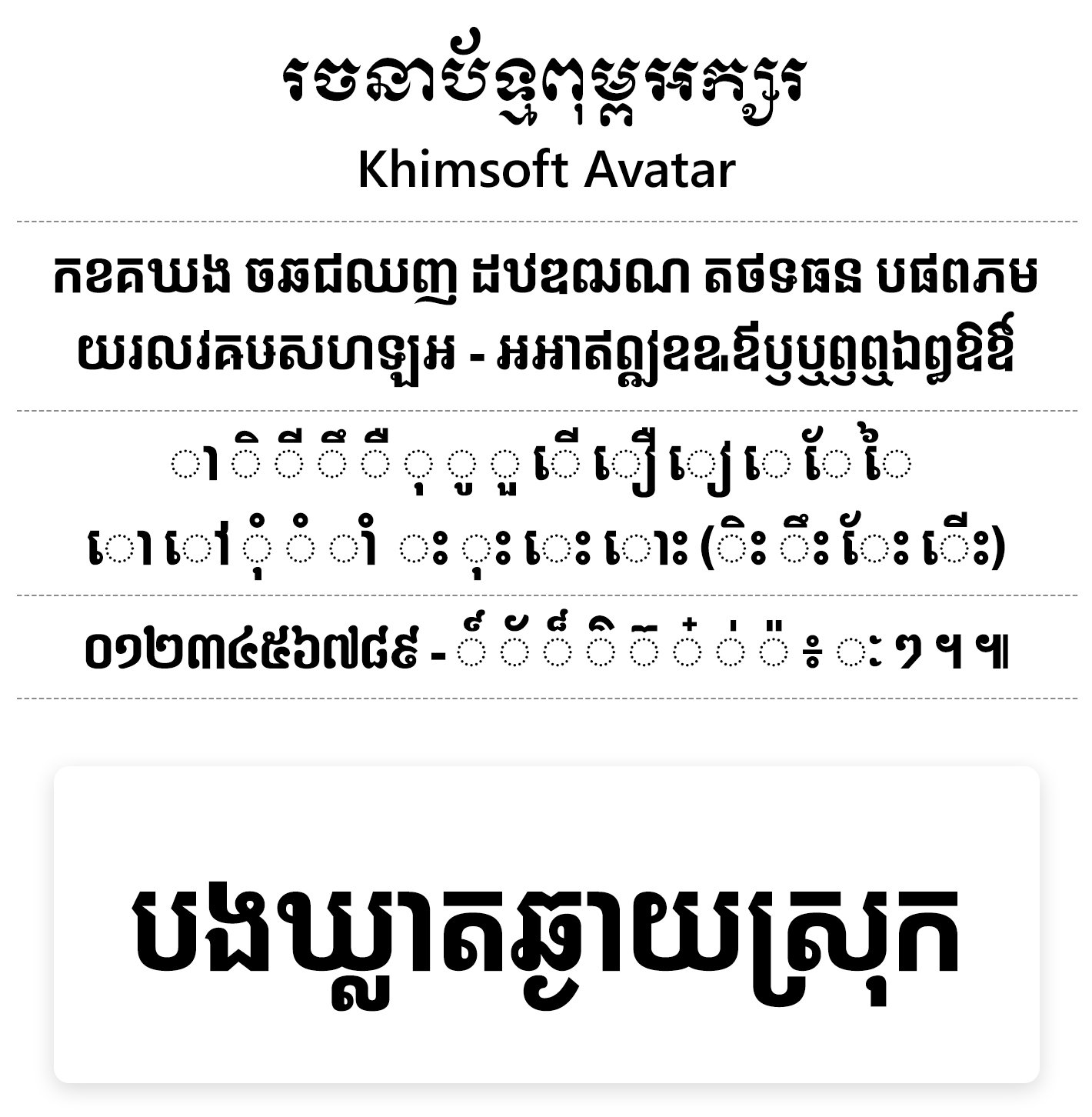 Khimsoft Avatar អក្សរនេះត្រូវបានរចនាឡើងតាមការនឹកឃើញប៉ុណ្ណោះ ឯឈ្មោះក៏ដូចគ្នា ទើបបានជាអក្សរនេះដាក់ឈ្មោះថា Khimsoft Avatar ។ ការ Design ត្រូវបានធ្វើឡើងក្នុងគោលបំណងប្រើប្រាស់អក្សរនេះទៅតាមកាលវេលា និងការងារដែលអ្នកអាចប្រើប្រាស់បាន ។