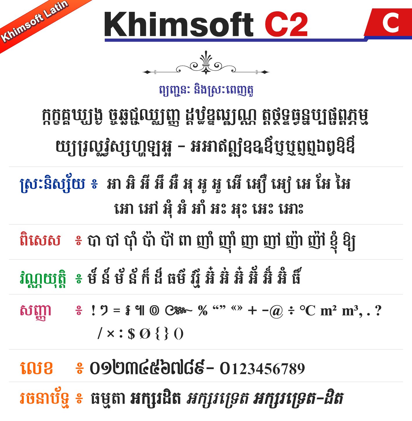 Khimsoft C2 ជាប្រភេទអក្សរ Khimsoft-Latin ដែលជាប្រភេទអក្សរដំណើរការដោយ Script ឬប្រភេទជាអក្សរឡាតាំង (មិនមែនជាយូនីកូដ) ដែលជាអក្សរមួយប្រភេទសម្រាប់ប្រើប្រាស់ជាមួយនឹងកិច្ចការទាំងឡាយណាដែលមិនគាំទ្រសម្រាប់អក្សរយូនីកូដ ។ ជាទូទៅអក្សរនេះអ្នកអាចប្រើជាមួយនឹងកម្មវិធីកាត់វីដេអូ ឬជាមួយនឹងកម្មវិធីក្រាហ្វិកដែលលំបាកក្នុងការប្រើប្រាស់អក្សរយូនីកូដក៏បាន ក្នុងនោះមានដូចជា AutoCAD, Sony Vegas, CNC Software ជាដើម ។