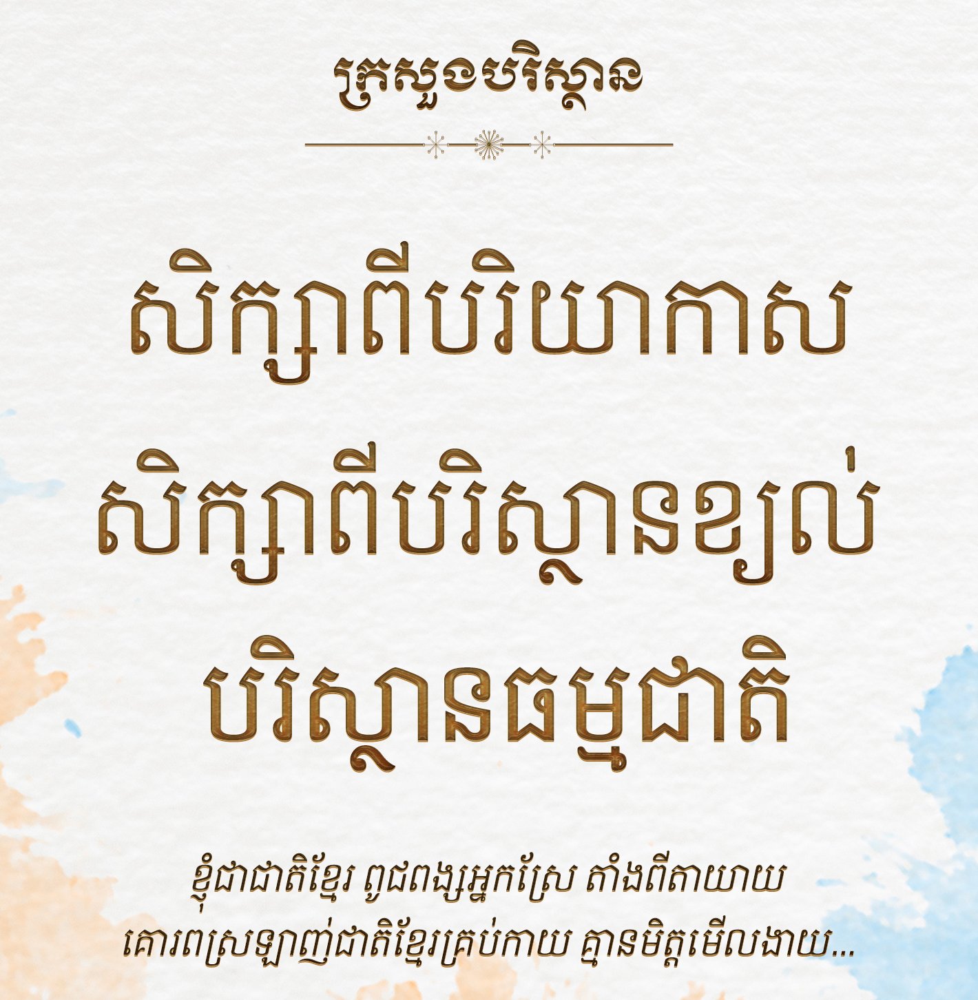 Khimsoft MOE ត្រូវបានបង្កើតឡើងសម្រាប់ក្រសួងបរិស្ថាន ។ ការរចនាត្រូវបានធ្វើឡើងតាមការរៀបចំរបស់ Khimsoft តែប៉ុណ្ណោះ វាមិនមែនជាការផ្ដល់នូវអនុសាសន៍ឬស្នើសុំណាមួយពីអង្គភាពសាមីឡើយ ហើយអក្សរទាំងនេះអាចនឹងមានការប្រែប្រួលឬធ្វើបច្ចុប្បន្នភាព ដែលជាហេតុធ្វើឱ្យតំណចាស់អាចនឹងត្រូវបានលុបចេញ តែយ៉ាងណាគ្រប់ពុម្ពអក្សរទាំងនោះ យើងខ្ញុំនៅតែរក្សាក្នុងបញ្ជីពុម្ពអក្សរតាមស្ថាប័នឬក្រសួងនោះដដែល ។