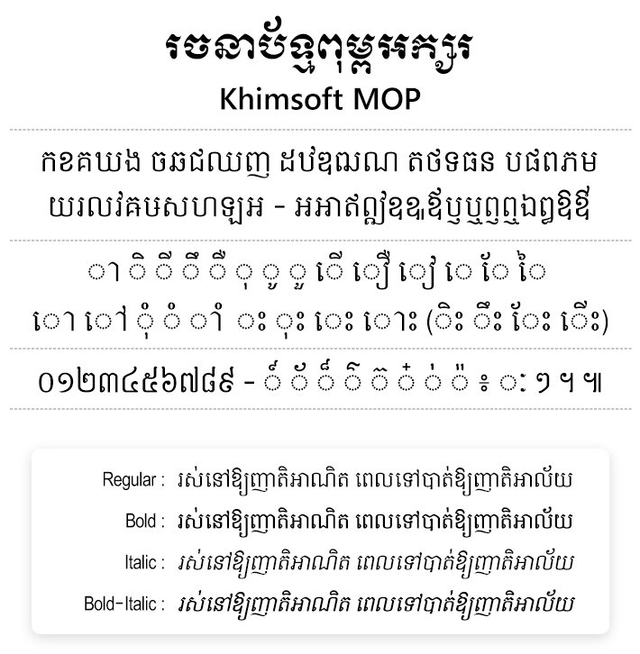 Khimsoft MOP ត្រូវបានបង្កើតឡើងសម្រាប់ក្រសួងផែនការ ។ ការរចនាត្រូវបានធ្វើឡើងតាមការរៀបចំរបស់ Khimsoft តែប៉ុណ្ណោះ វាមិនមែនជាការផ្ដល់នូវអនុសាសន៍ឬស្នើសុំណាមួយពីអង្គភាពសាមីឡើយ ហើយអក្សរទាំងនេះអាចនឹងមានការប្រែប្រួលឬធ្វើបច្ចុប្បន្នភាព ដែលជាហេតុធ្វើឱ្យតំណចាស់អាចនឹងត្រូវបានលុបចេញ តែយ៉ាងណាគ្រប់ពុម្ពអក្សរទាំងនោះ យើងខ្ញុំនៅតែរក្សាក្នុងបញ្ជីពុម្ពអក្សរតាមស្ថាប័នឬក្រសួងនោះដដែល ។